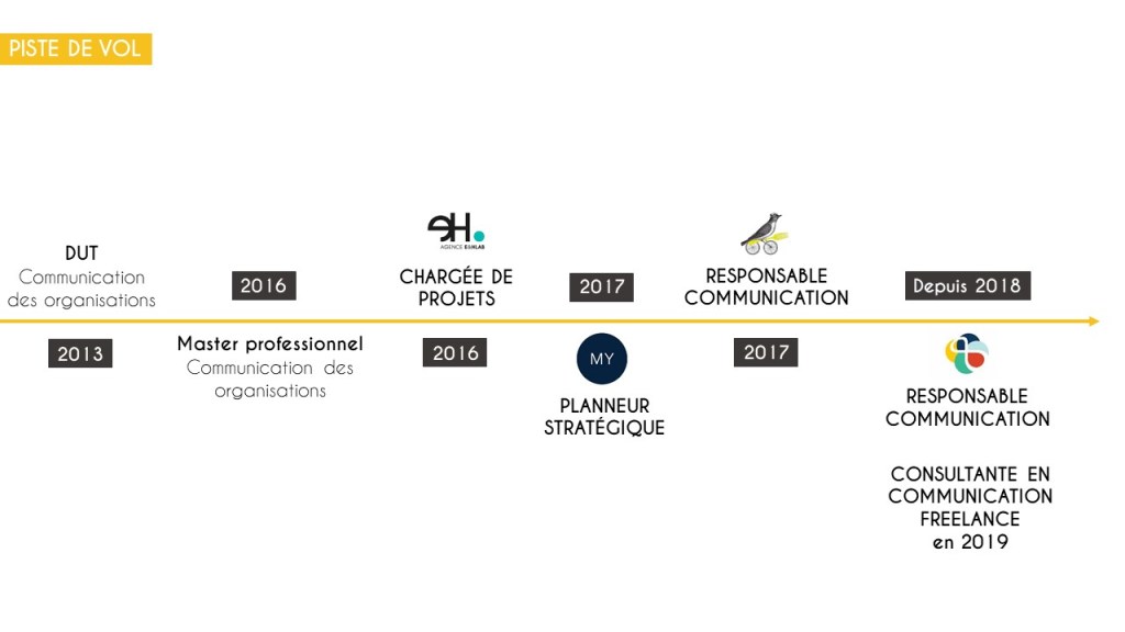 🐣 Après 3 années passées en agence de communication et en entreprise, j’ai décidé de voler de mes propres ailes en devenant en 2019 consultante en communication freelance. En parallèle, j’ai été pendant 3 ans responsable de la communication de l’institut Villebon – Georges Charpak, un centre d’innovation pédagogique où sont imaginées et/ou testées différentes méthodes d’enseignement. A ce jour, je travaille uniquement à mon compte. Je suis notamment déléguée communication pour le réseau d’écoles d’ingénieurs ParisTech.