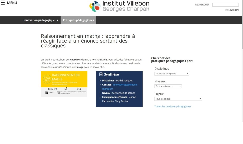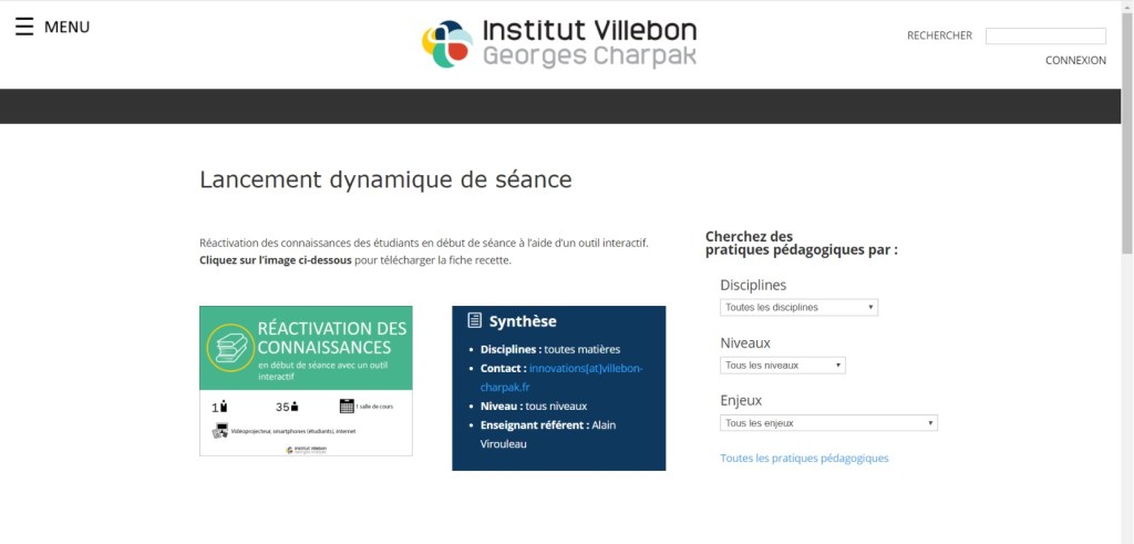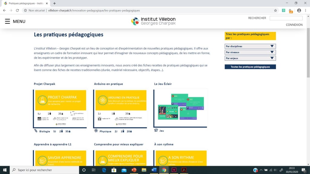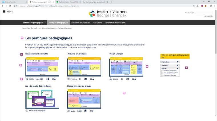 Le besoin : Pour diffuser les pratiques pédagogiques imaginées et/ou testées par les enseignants de l’institut, nous avons créé des fiches recettes de pratiques pédagogiques (voir le projet ici). Ces fiches, ainsi que plusieurs jeux en sciences développés à l’institut étaient mis à disposition sur le site internet dans la rubrique « pratiques pédagogiques ». Cette rubrique était peu attractive et peu intuitive. J’ai donc décidé de la refondre.