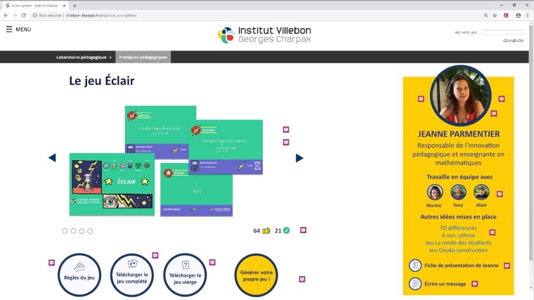 Comme vous pouvez le voir ci-dessus, la partie gauche de ces nouvelles présentations est dédiée à la pratique pédagogique (jeu ou fiche recette) avec un diaporama et divers boutons situés en dessous, dans lesquels diverses ressources complémentaires sont mises à disposition (supports de cours, vidéos, témoignages étudiants, photos, lien vers pedagomaker.fr pour créer soi-même sa propre fiche recette etc.).