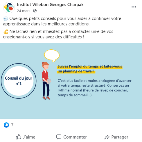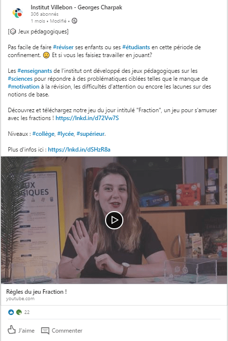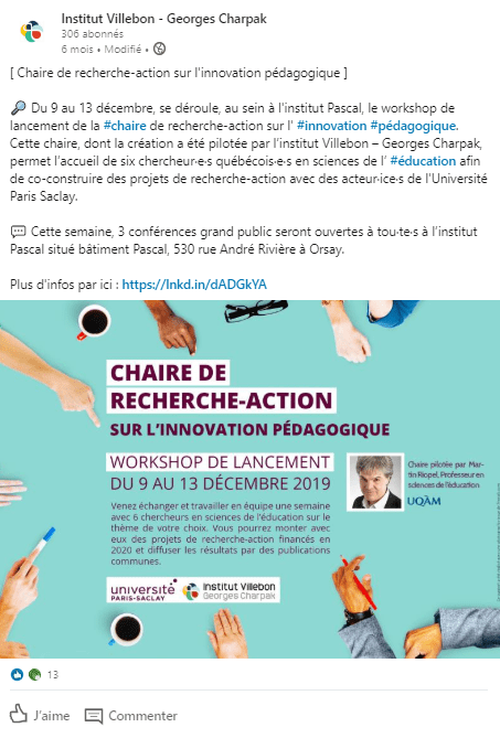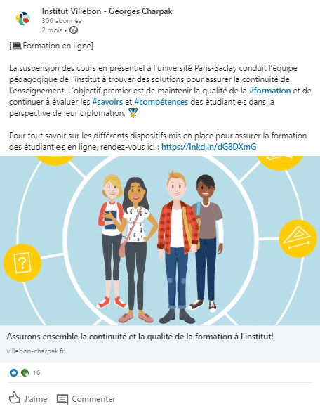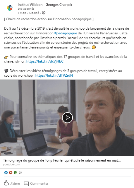 – Le compte Linkedin pour les contenus liés à l’innovation pédagogique et à la formation (les cibles à atteindre sur ce réseau sont les enseignants, les partenaires et les mécènes de l’institut).